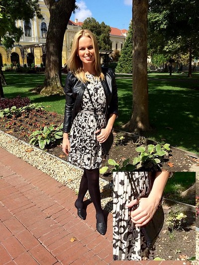 Könnyű, lenge muszlin ruha, ideális viselet langyos őszi napokra. Egy övvel kihangsúlyozhatjuk a derekunkat. Bőrdzsekit a reggeli hűvös órákra szoktam felvenni, hiszen ilyenkor fontos a réteges öltözködés. (Ismét aktuális a „lecke”: réteges öltözködés! A szerk.)