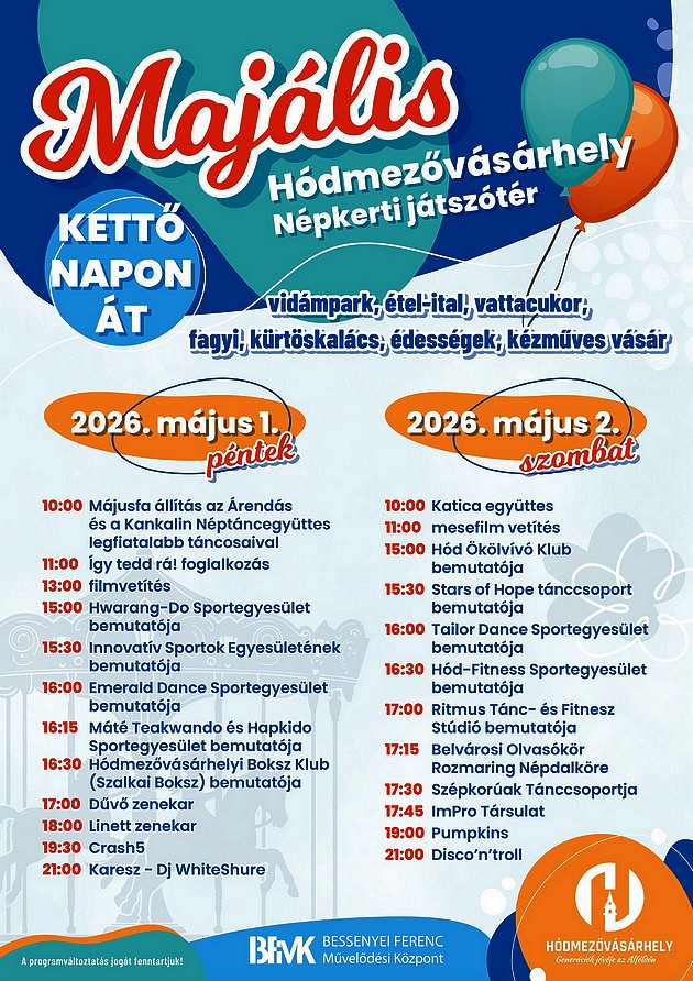 Ismét a Népkertben lesz a kétnapos Majális, elsején pénteken és másodikán, szombaton. A Vásárhely Kártya tulajdonosok számára ingyenes lehetőségek.